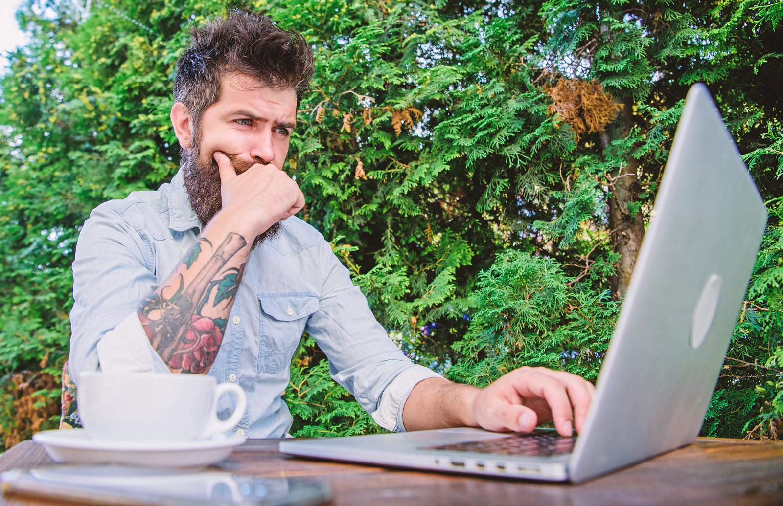 Watching blog for more information. Bearded man writing new blog post in summer cafe. Blogger keeping private blog. Hipster posting on online social network or blog on natural landscape